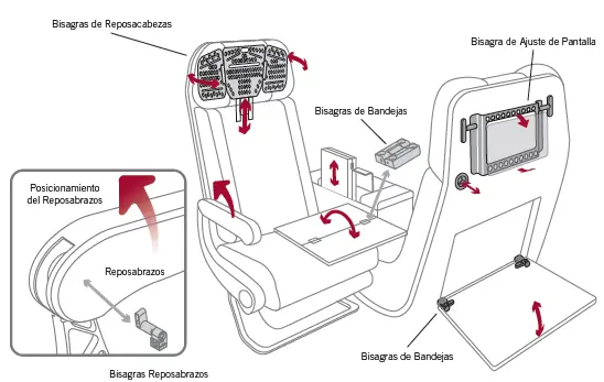 Tecnología de posicionamiento y bisagras que aseguran la funcionalidad y mejoran la ergonomía para el pasajero.